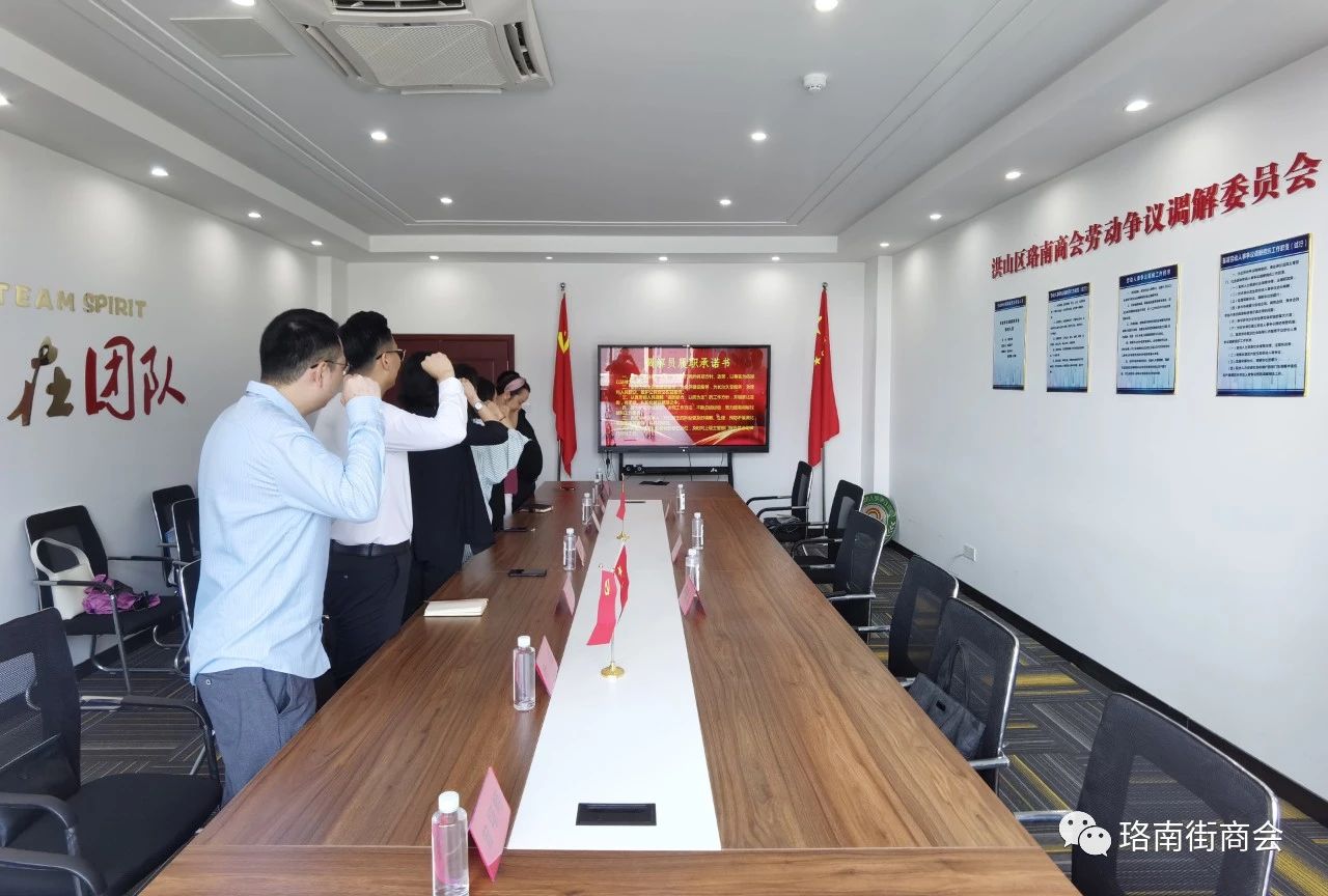 6月6日下午,武漢市洪山區珞南街街道商會勞動爭議調解委員會成立暨授牌儀式在天宇創意大廈1號樓9樓隆重舉行,區政府副區長張俊峰,區人力資源局局長李應清,區人力資源局仲裁辦主任李林,商會會長、武漢科銳芯電子科技有限公司董事長駱為民,黨支部書記張娜,秘書長楊麗萍,副會長楊威等出席了此次授牌儀式。